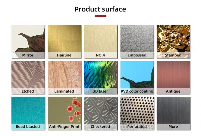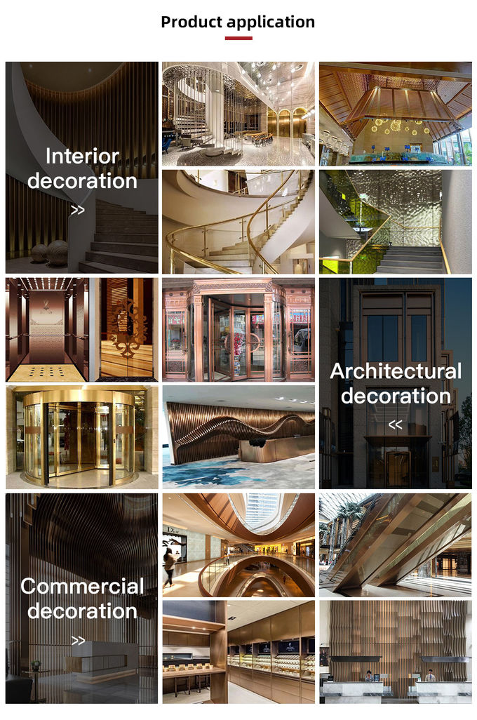또한 스테인리스 스틸의 가단성은 디자이너와 아티스트가 무한한 창의성을 발휘할 수 있도록 합니다.다양한 가공 및 처리 기술을 통해 스테인리스 스틸은 다양한 프로젝트 요구 사항에 맞게 다양한 모양, 질감 및 패턴으로 만들 수 있습니다.전기화학적 착색, PVD(Physical Vapor Deposition) 코팅, 분무 및 코팅과 같은 기술을 통해스테인레스 스틸금색 톤과 무지개 색조에서 브러시 표면과 복잡한 질감에 이르기까지 다양한 모양을 보여줍니다.