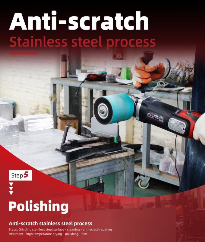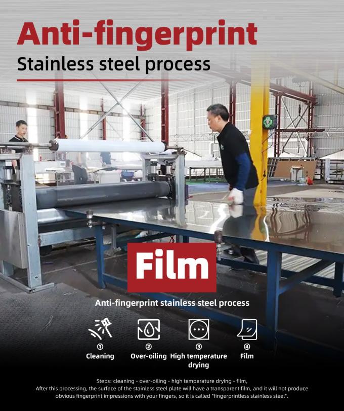 4마지막 단계는 필름 적용입니다.필름 적용 과정을 통해 스테인리스 스틸 표면에 투명한 보호 필름이 형성되어 오염 방지 및 스크래치 저항성 특성을 제공합니다.이것은 또한 "발자국 없는" 효과의 열쇠입니다., 사용 중에 제품이 눈에 띄는 지문 흔적을 남기지 않도록합니다.