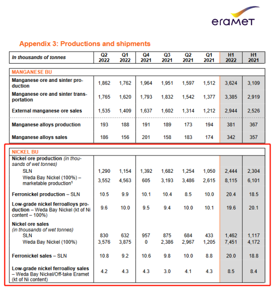 인도네시아에서, 광산은 33% 전년 위로, 2022년의 전반부에 매매할 수 있는 니켈 광석의 거의 810만 습식 톤을 생산했습니다. 외부 금 분기의 판매는 79% 전년 위로, 750만 습식 톤을 초과했습니다. 또한 더 마인에 의해 공급된 니켈-철 합금 공장이 19,600 톤을 전반전에서 생성시켰습니다. 에라메트는 유통관 계약의 일부로 8,500 톤을 팔았습니다. 기간 동안, FCF 그룹에 대한 웨다 만의 공헌은 €121 백만을 합계했으며, €107 백만이 지급배당금과 주주 대출의 상환과 관련되었습니다.